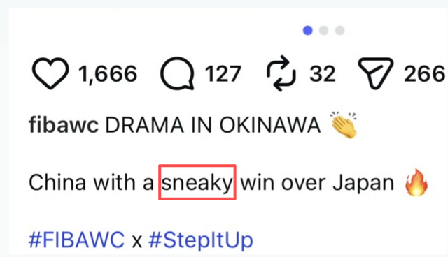 2月26日中国男篮在冲绳客场87比80逆转日本队后,FIBA篮球世界杯官方社媒账号在战报里写下“ChinawithasneakywinoverJapan”(“sneaky”在英语里带着“鬼鬼祟祟、不光彩”的暗示,多家媒体译作“偷走一场胜利”),随即引发舆情。相关帖文随后被删除;2月27日,FIBA在其官方微信发布中英双语致歉,明确向中国国家队、中国球迷以及中国篮球界致歉,承认措辞不妥,并强调中国队胜利来自实力、拼搏与决心。