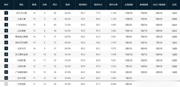CBA常规赛补赛已经打完,广州男篮主场93-85力克山东男篮,拼下一场关键胜利。这场焦点之战结束之后,第一阶段完成积分榜排名正式出炉,前12名球队排名由高到低如下:广厦、上海、广东、山东、青岛、深圳、北京、浙江、宁波、山西、广州、辽宁。第二阶段常规赛还有19场比赛,从目前各支球队的竞技状态和综合实力来看,宁波、广州这两大黑马很有可能成为季后赛搅局者,除了排名前八球队基本保住季后赛席位之外,剩余四个名额都有一定的变数。